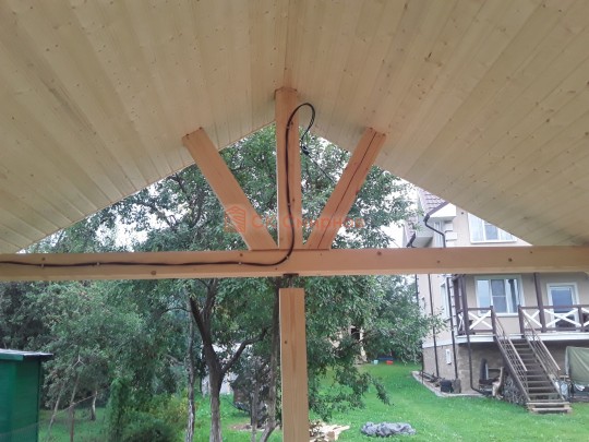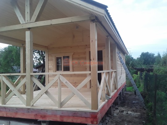 Обратите внимание на столбы, установленные на террасе: они закреплены на домкраты. Это делается для того, чтобы после усадки (а она будет даже при стройке из сухого бруса) можно было выставить нужный уровень. Это предотвратит перекосы крыши — всё продумано.