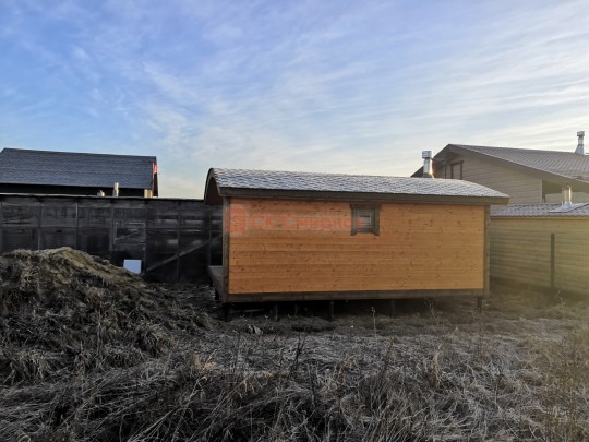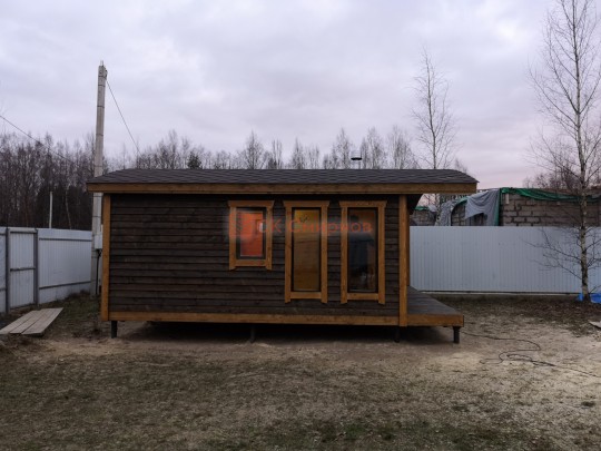 Для строительства этой красивой каркасной бани 5х6 метров СК Смирнов разработал авторский проект №217 с обустроенной парной из алтайского кедра и комнатой отдыха. По планировке общая площадь составляет 32 квадратных метра — есть сауна и просторная жилая комната с впечатляющими панорамными окнами во всю стену.