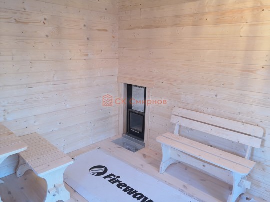 Установка печи Теплодар Русь сетка 12 л панорама ( со стеклянной дверцей ), трубы сэндвич, проходы и зонт входят в стоимость бани. Экран металлический через стену. На полу кладется кирпич, базальтовый картон, минерит. На стенах базальтовый картон, минерит, через втулки прикручивается минерит. Ссылка на сайт производителя https://www.teplodar.ru/catalog/detail/rus_setka_12_l_panorama/
