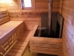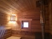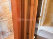 Кедровая вагонка в парной, спинки над пологами и декоративная решётка между пологами. Дверь крашеный усиленный стеклопакет (снаружи RAL 8017, изнутри «Жёлтый»);