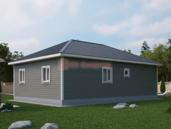 В доме всего один этаж, но есть нежилой чердак. Лестница на него не предусмотрена, но можно сделать складную. На входе сделан маленький тамбур или прихожая. Кухня объединена с гостиной, есть совместный санузел, техпомещение под котельную, спалья и детская.